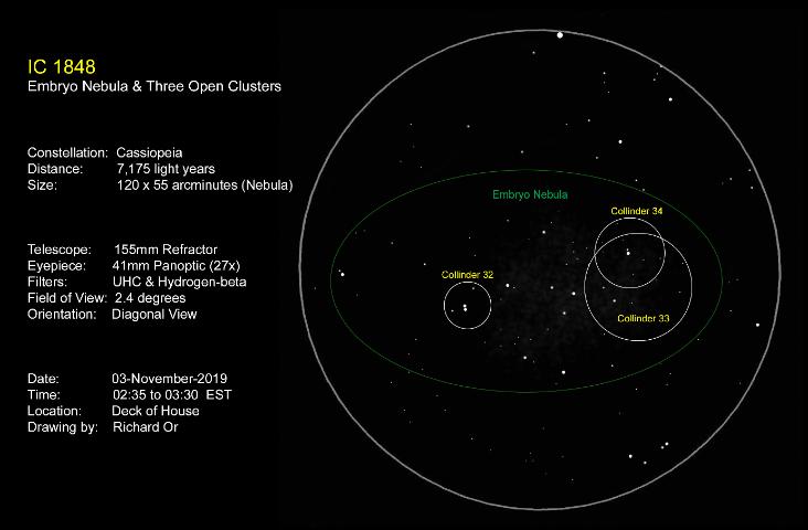 Clusters (Collinder 32, 33 & 34) are lumped together under the designation IC 1848. I