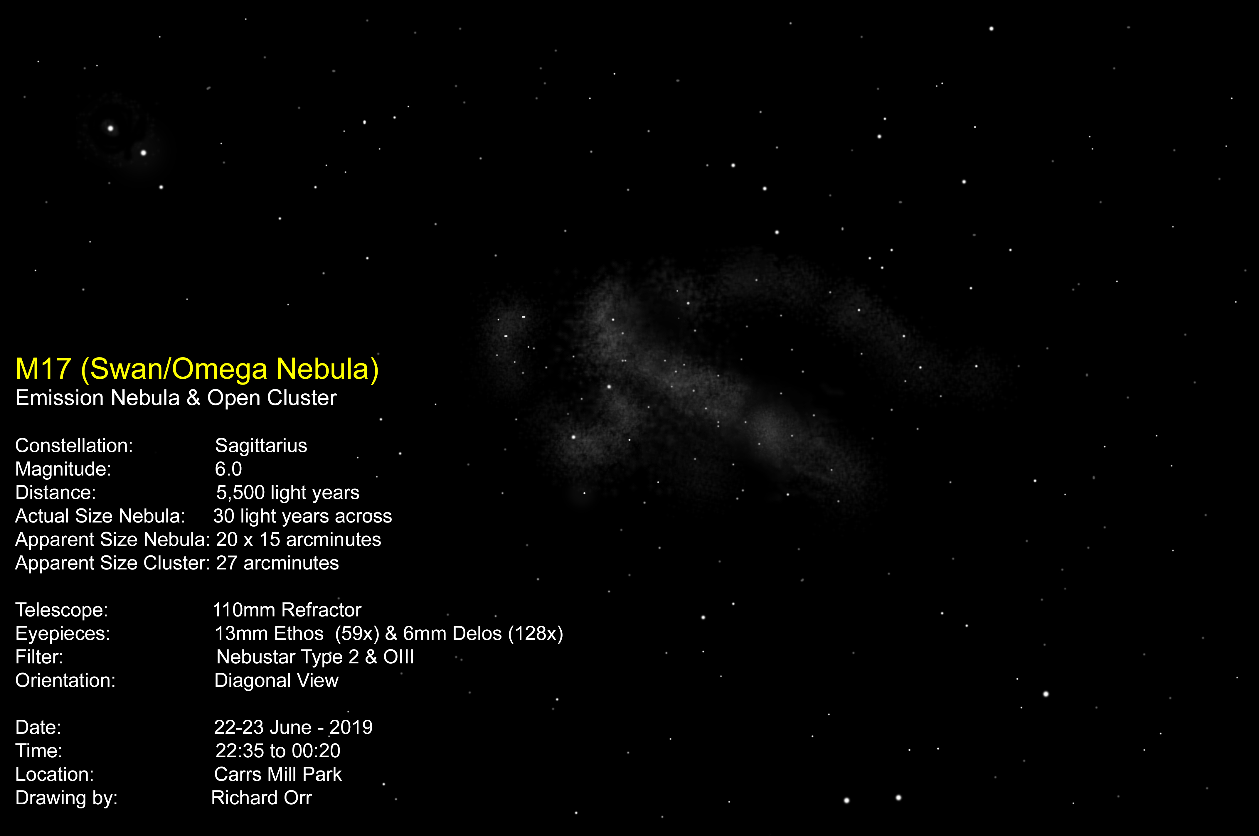 the grander of M17 in the eyepiece. In my drawing’s orientation the swan is upside down and