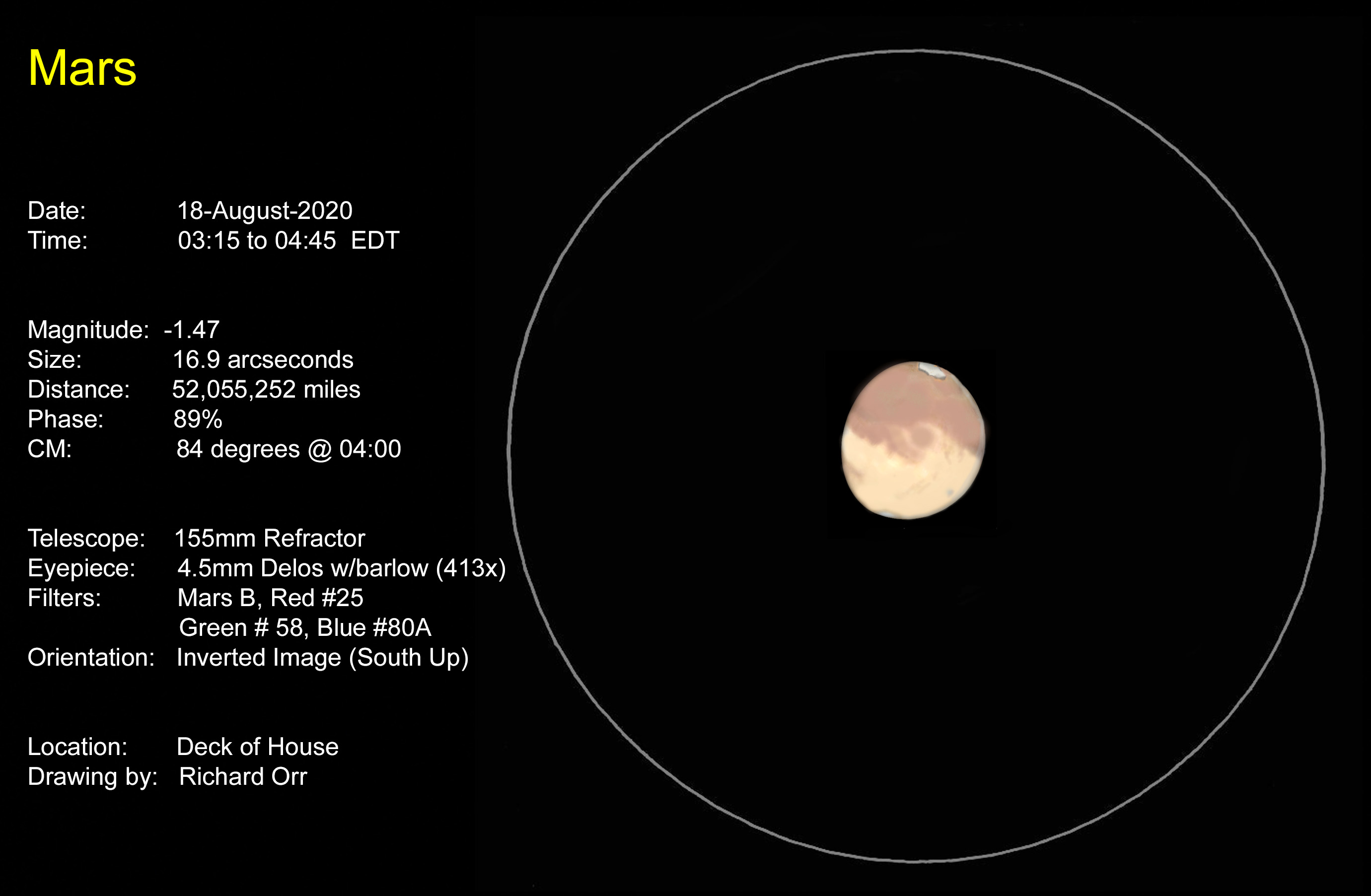 Mars as seen on August 18, 2020. The Eye-of-Mars (Solis Lacus), is near the center of