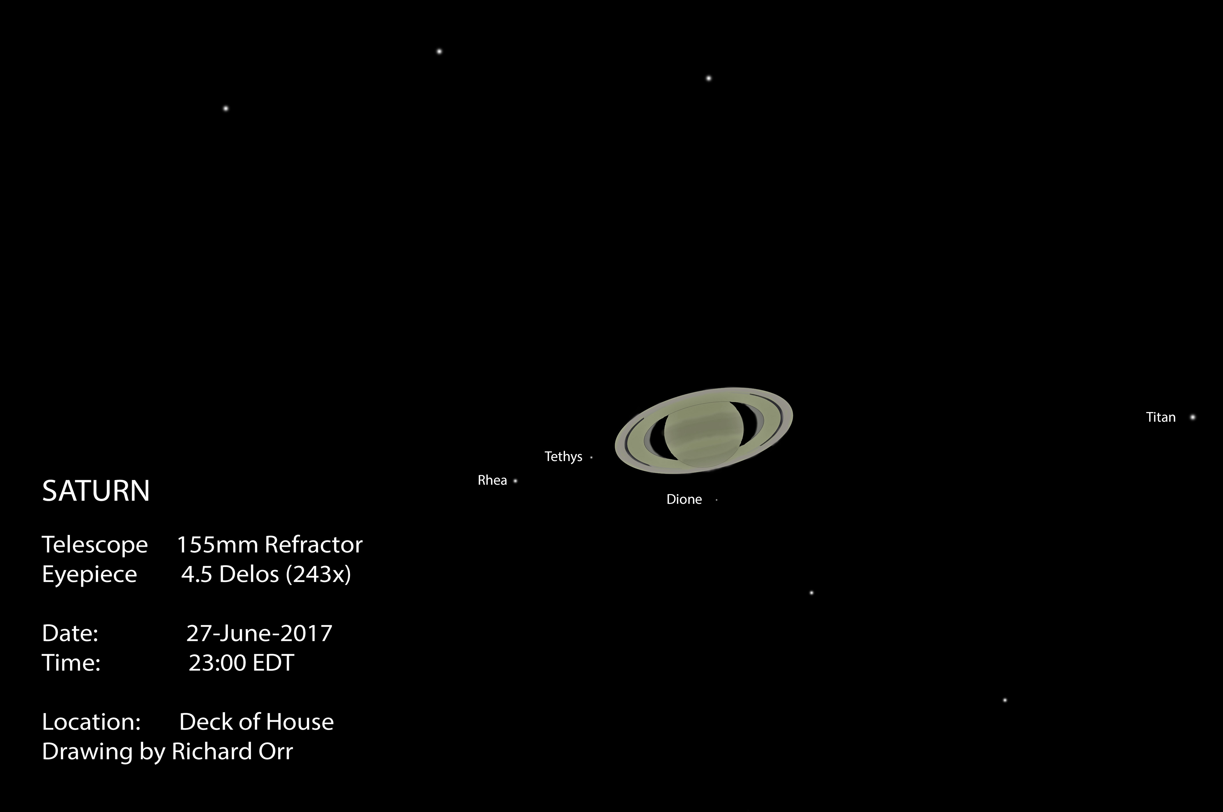 Saturn with its rings wide open and showing four moons, it begged to be drawn.